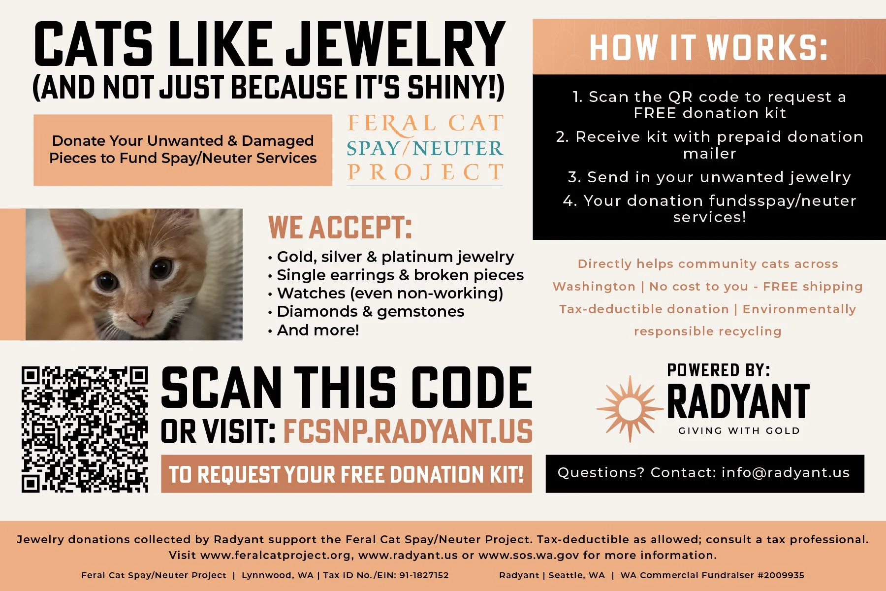 You can send your donation to: Feral Cat Spay/Neuter Project, PO Box 2460, Lynnwood, WA 98036.